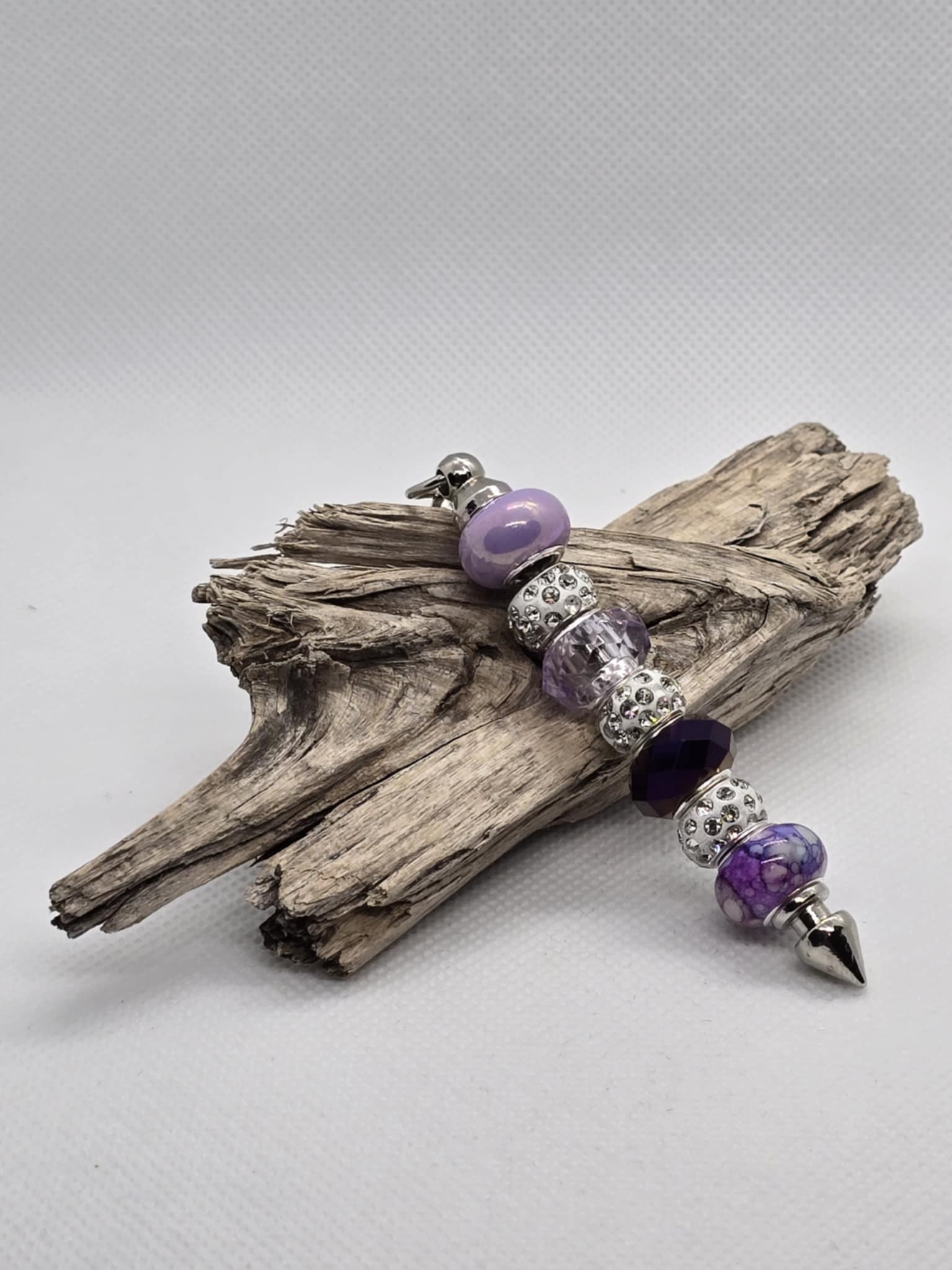 Stiff keychain accented with Purple beads.