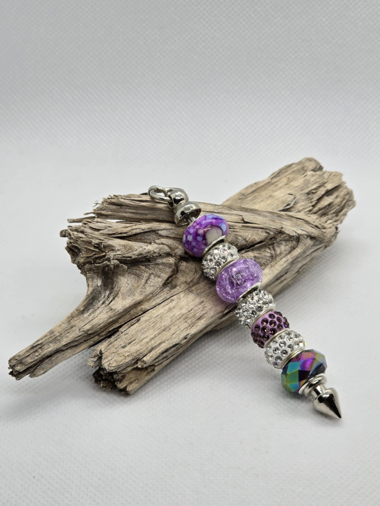 Stiff keychain accented with purple beads.
