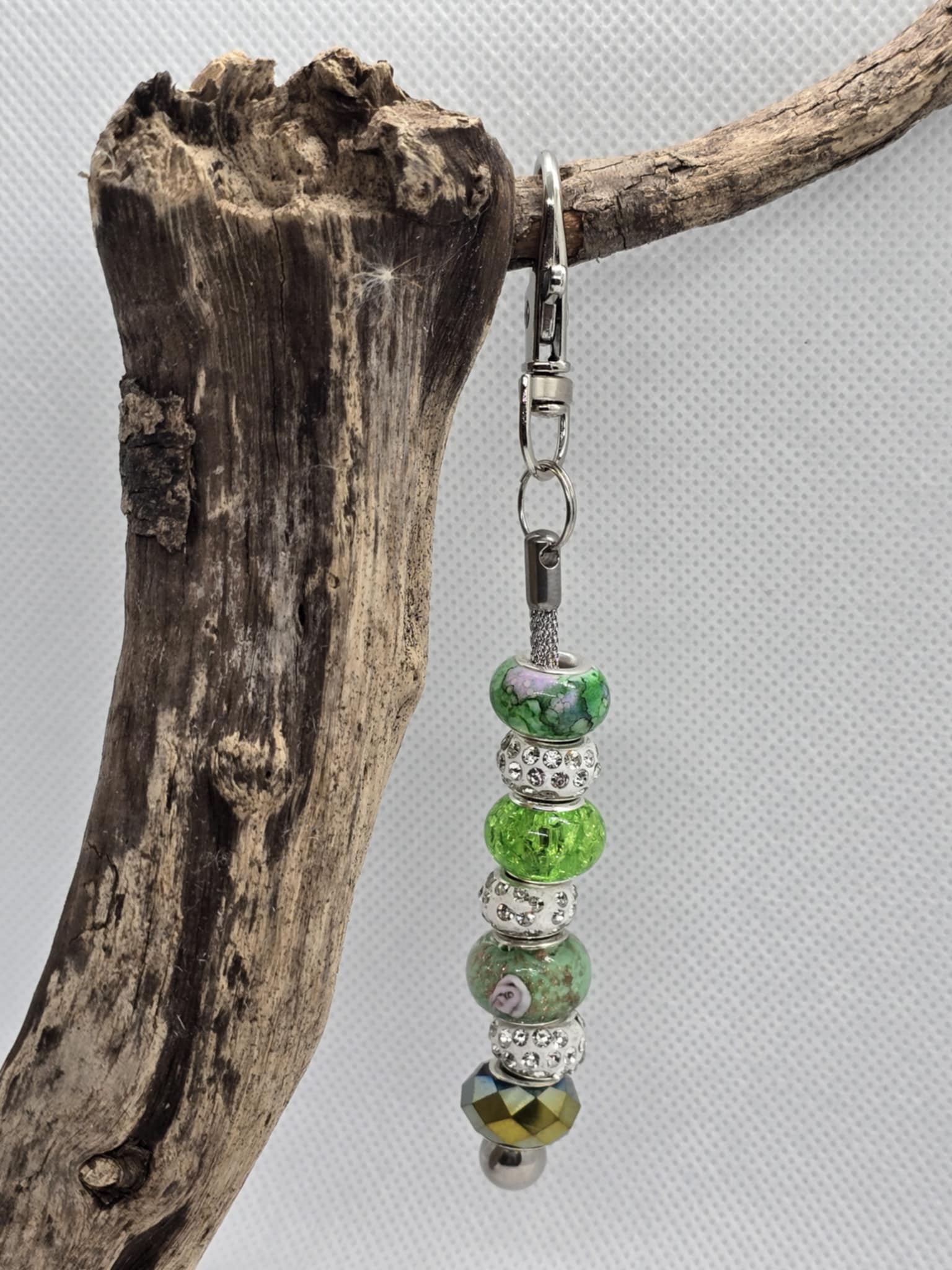 Bendy Keychain accented with green, and white jeweled beads.