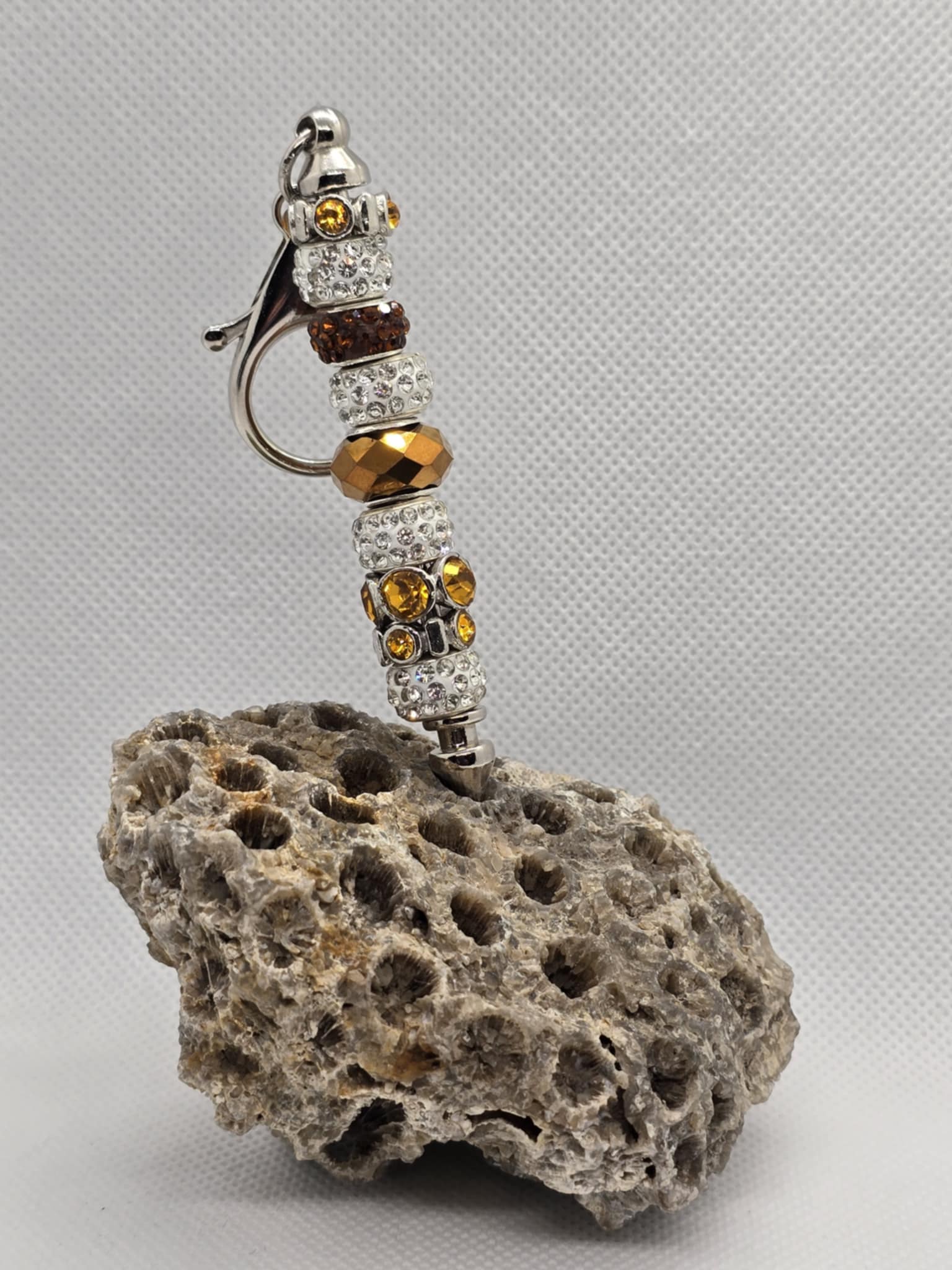 Stiff keychain accented with brown and orange beads.