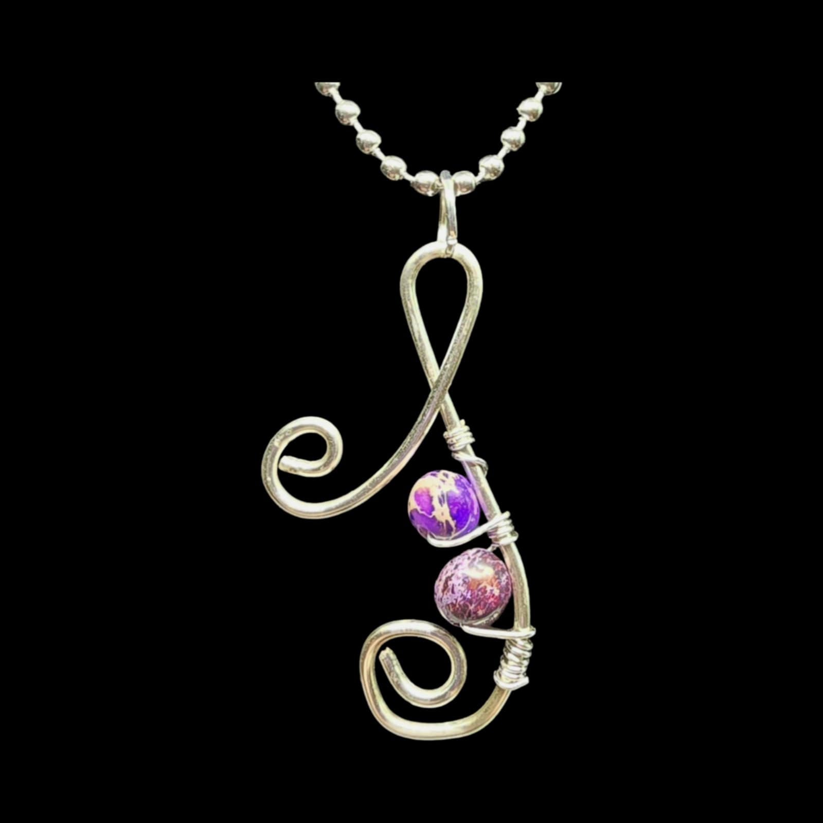 17-inch silver ball chain necklace and charm with purple accented beads.