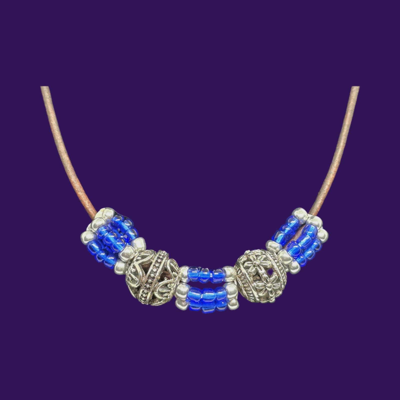Approximately 19.5-inch leather necklace with dark blue homemade beads.