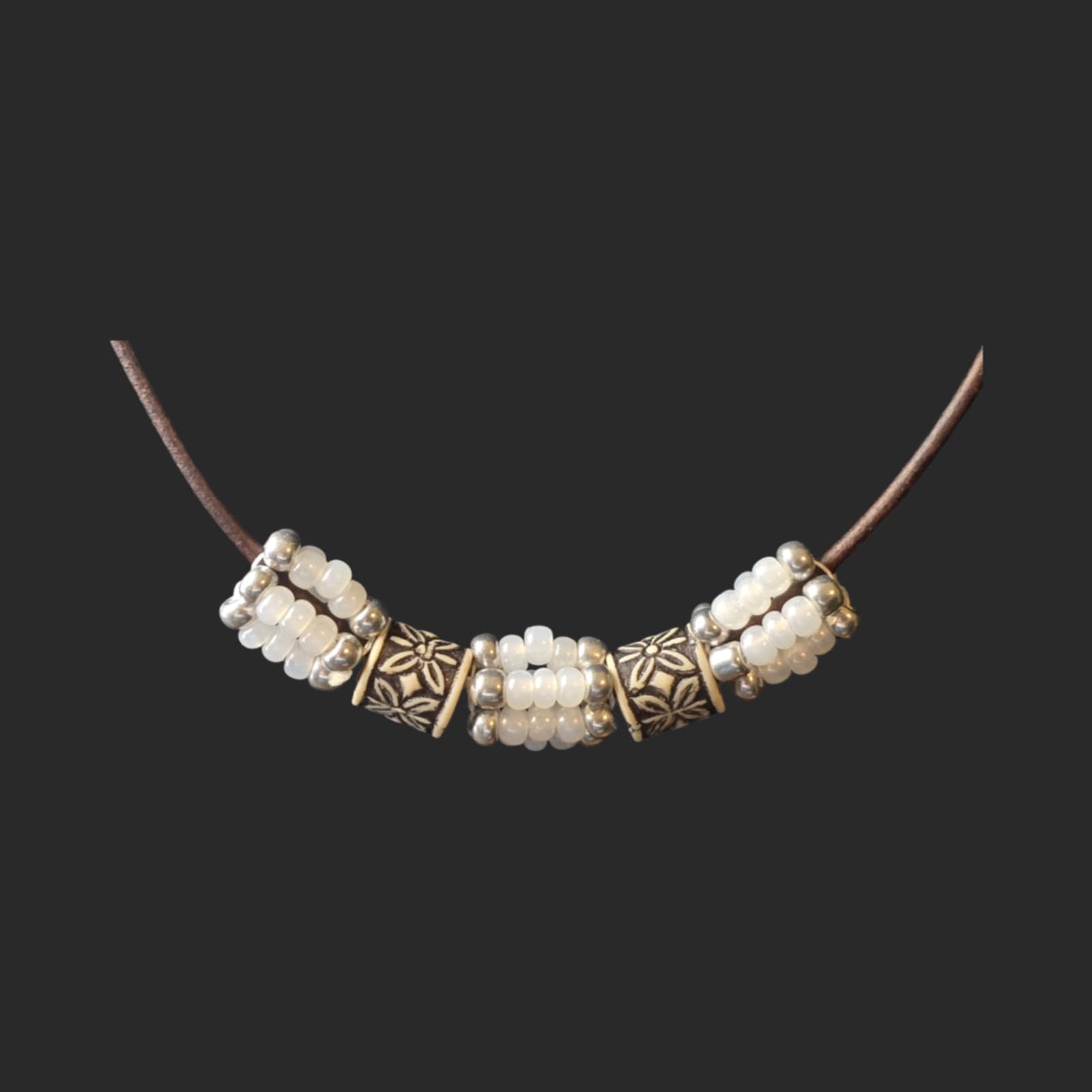 Approximately 20-inch leather cord necklace with white handmade beads.